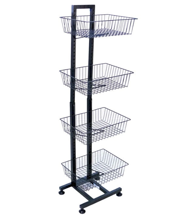 Transform your retail environment with the Adjustable 4 Tier Wire Basket Stand. This stylish and functional display features four adjustable wire baskets, each measuring 16" W x 12" D, providing generous storage for a variety of products. With a sleek matte black finish, it seamlessly fits into any retail setting. Whether you're showcasing seasonal items or everyday essentials, this versatile display enhances product presentation and accessibility. Upgrade your shop today with this essential 4 tier wire basket display and watch your sales soar.
